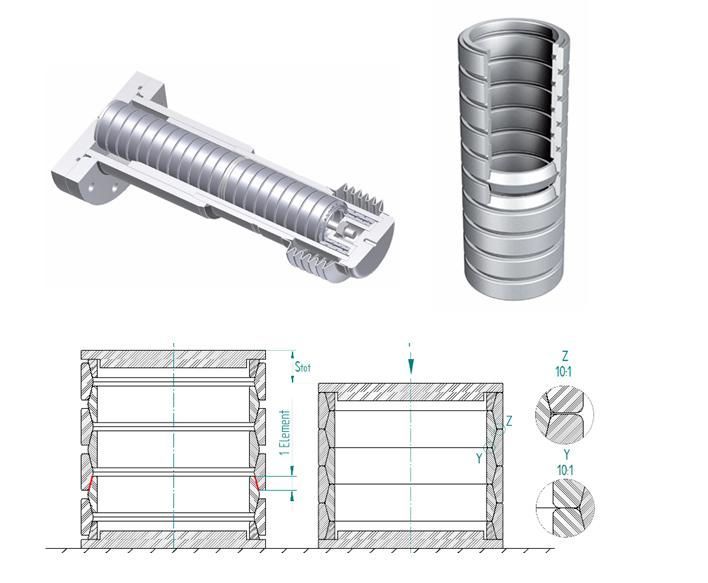 Accordingly, the total spring travel of a friction spring is the product of the number of elements e and the spring travel se, whereby the spring force does not change with the number of elements. In contrast to other spring types, the circumferential stresses are almost uniformly distributed over the cross-sectional area of the loaded spring elements. Therefore, each volume element is utilized uniformly. This helps reduce the weight of the friction spring compared to other conventional spring types, where the cross-section is dimensioned according to the maximum edge stresses, while the neutral axis (core) remains unloaded.